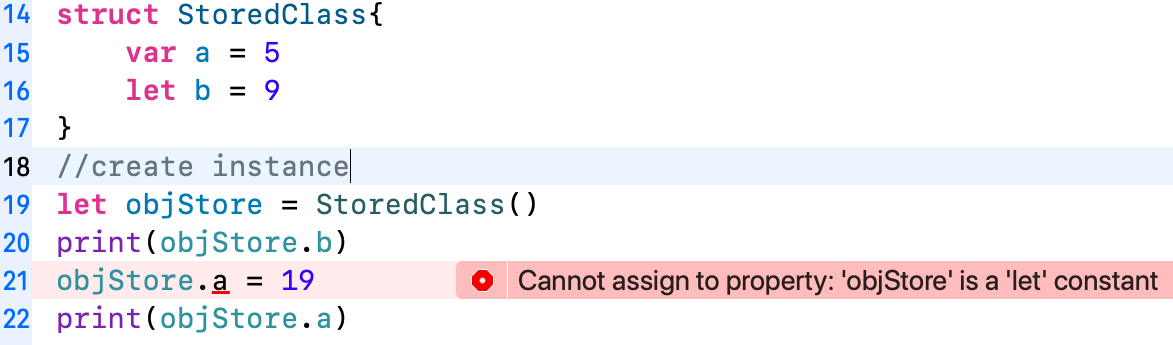 Whereas if we try to do the same in struct which is value type create an instance let(constance) it will show us a compilation error "Cannot assign to property: 'objStore' is a 'let' constant".